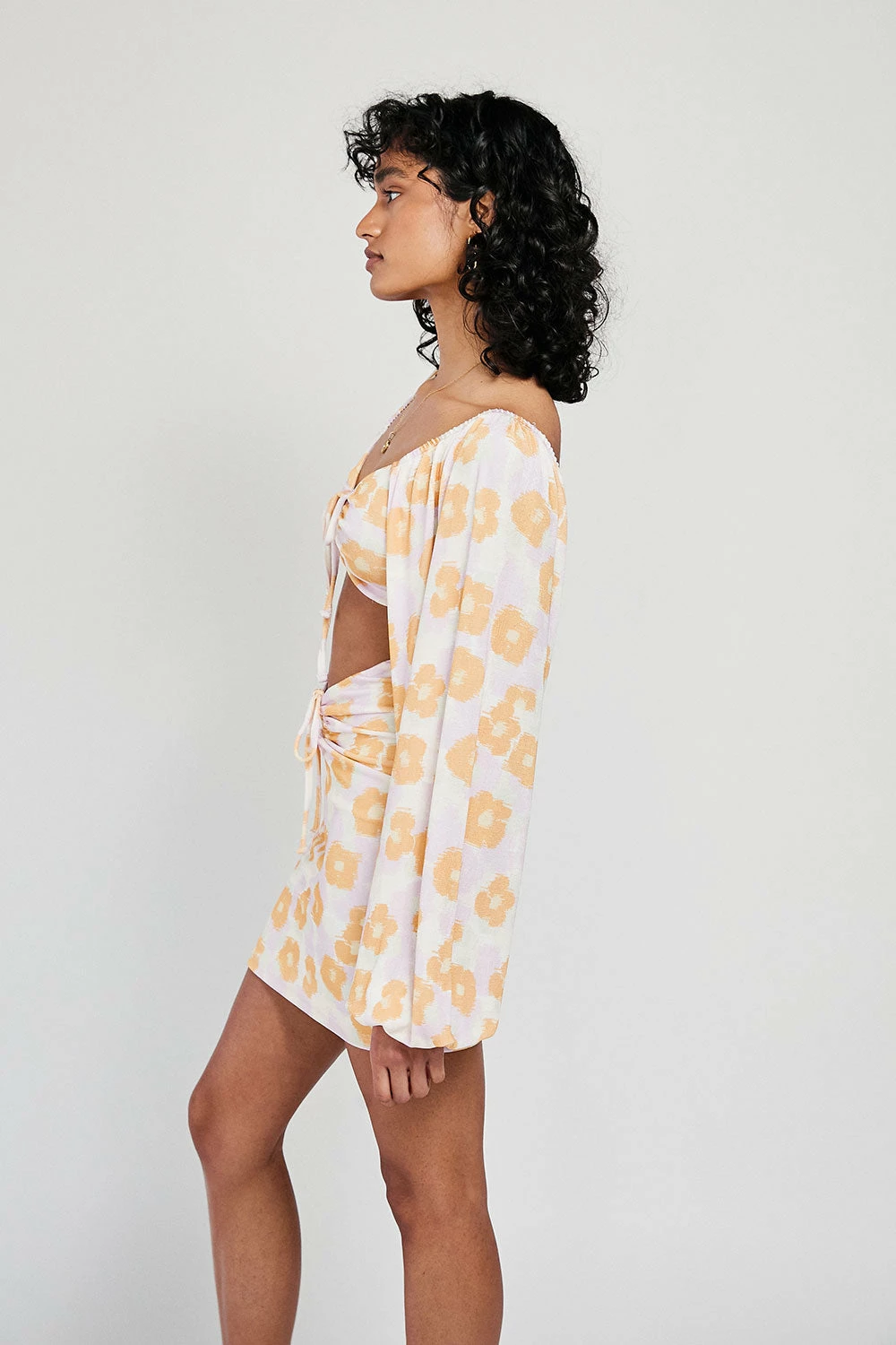The perfect outfit for a night out! The Addilyn Dress is made from a slinky fabric with our exclusive smudge floral print. It features full length puff sleeves, keyhole cutout at centre bust, cutout at waist and fitted skirt with a fixed tie detail at centre front. Pair with the Strappy Asteria Heels and gold accessories! Designed exclusively by Sabo.