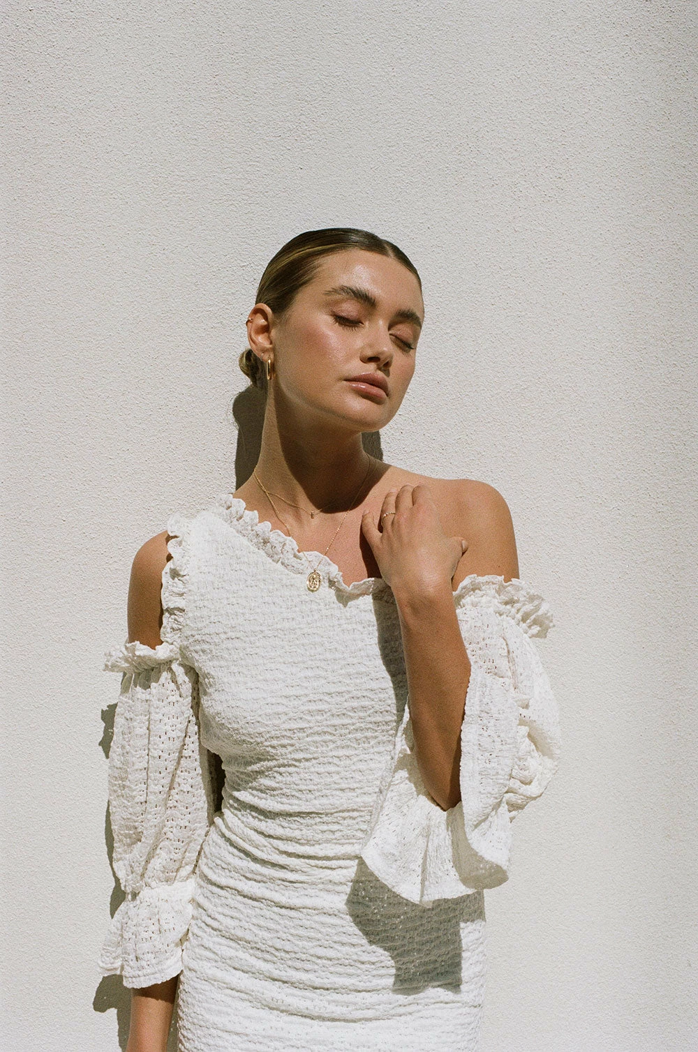 Perfect for an event, the Aluer Backless Dress is made from a stunning flower lace in white. It is a backless style featuring cold shoulder puff sleeves with frill cuffs, ruffle trims at bodice and a fitted midi length skirt. Style your look with the Strappy Rafaela Heels! Designed exclusively by Sabo.