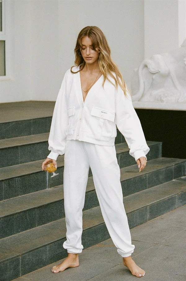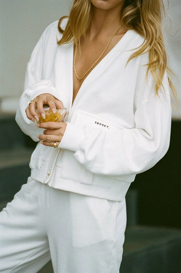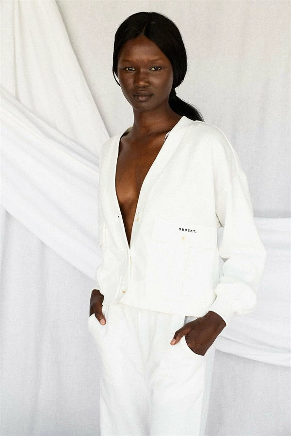 *THIS IS A FINAL SALE ITEM* Wear it as a set or pair it with your favourite denim! The Amada Top is made from a terry back sweater fabric in off white. It features a plunging neckline with buttons at front, full length sleeves, twin pockets at front with SBO SKT embroidered detailing and contrast ribbed trims throughout. Pair with the Amada Pants. Exclusively designed by Sabo.