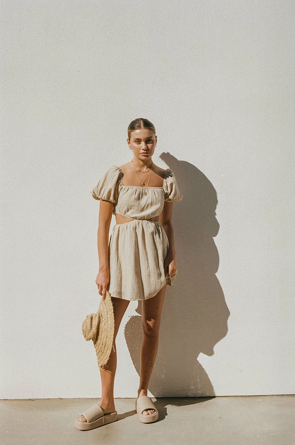 A pleasant cut in a creamy hue! The Amara Dress is made from a natural textured cotton fabric in a beige hue. It features short puff sleeves, square elastic neckline, cutouts at waist and a flouncy skirt. Style your look with gold accessories and neutral sandals! Designed exclusively by Sabo.