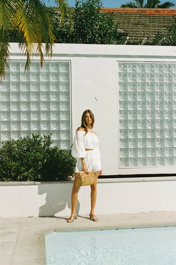 The fabric of our dreams! The Amica Shorts are made from a natural cotton white fabric with textured stripes throughout, they are a high waisted style featuring an elasticated waist with drawstring, twin pockets at front and high-low hems. Pair with the Anica Off Shoulder Top and Rico Handle Bag! Designed exclusively by Sabo.