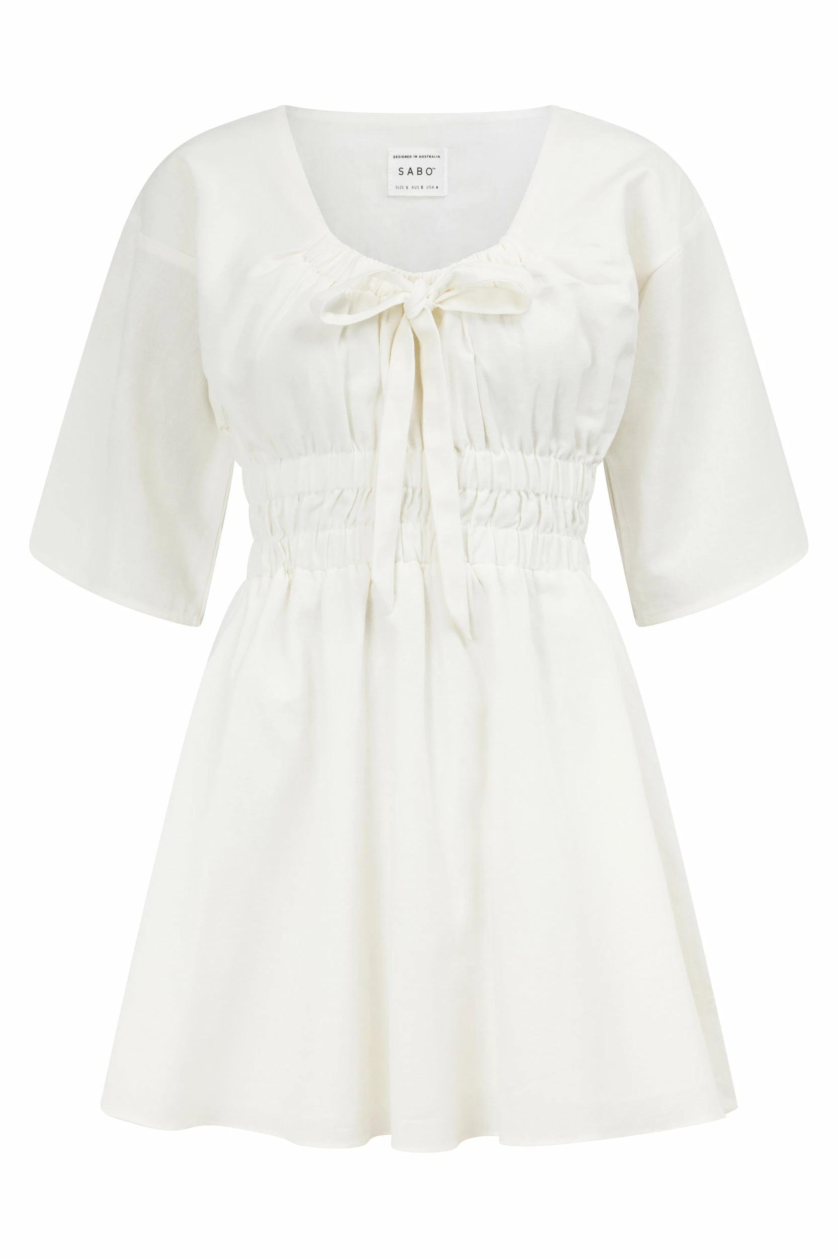 Made from a high quality natural cotton slub fabric in white, the Ariarne Dress features a rounded neckline with tie detail, 1/2 length sleeves, elastic details at waist and flouncy skirt. Style your look with white heels and the Gabrielle Chain Earrings! Designed exclusively by Sabo.