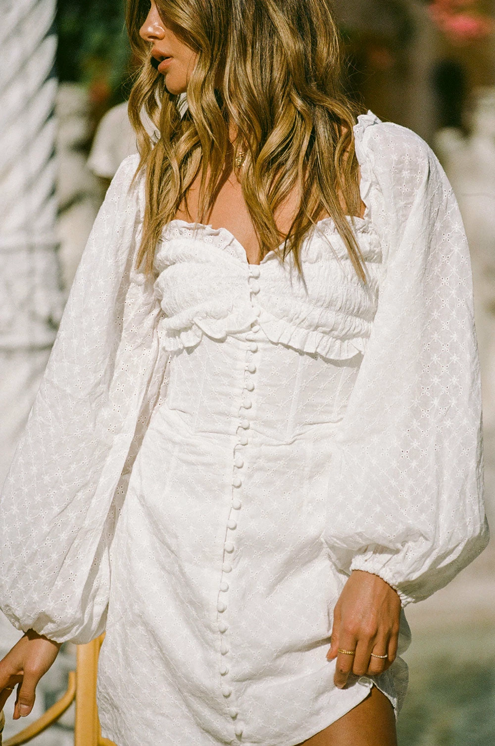 The perfect look for your next event! The Dion Button Dress is made from a natural cotton fabric with embroidered detail. It features full length puff sleeves, ruffle detail at bust, fitted corset waist and covered buttons down centre front. Pair with the Transparent Mules and Riella Bag! Designed exclusively by Sabo.
