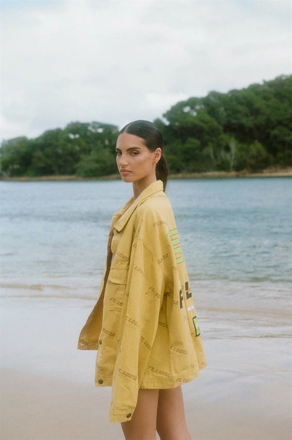 The Era Denim Jacket is a unisex style made from a thick cotton mustard denim with brown signature FT. Louisa throughout. It is an oversized style featuring patch and green and black printed detailing at back. By FT. Louisa.
