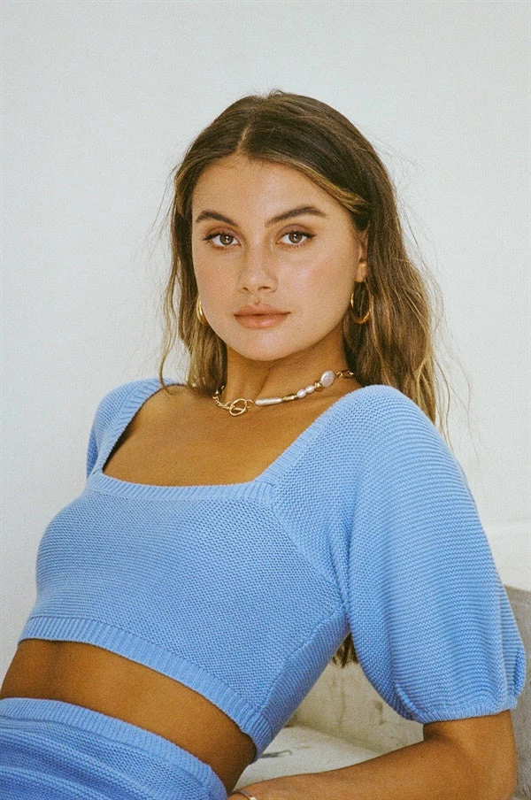 A simple style in the most stunning colour! The Graylee Knit Top is made from a natural cotton knit in a blue hue. It is a cropped style with short puff sleeves with contrast ribbed trims and a square neckline. Get the set with the Graylee Knit Skirt or pair with jeans! Designed exclusively by Sabo.