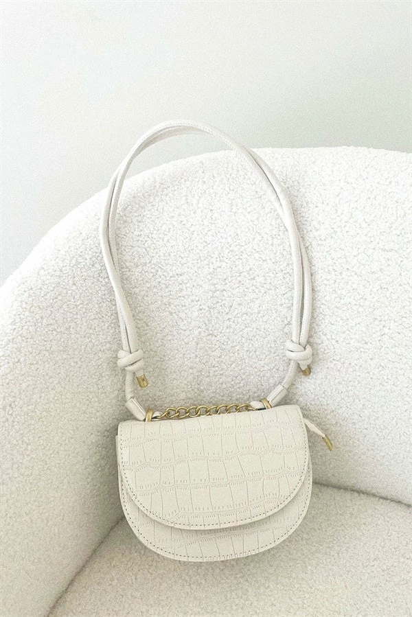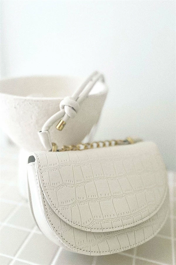 The super chic Lima Saddle Bag is made from a vegan croc skin in a cream hue. It features a double strap with knotted detailing and vintage style gold toned hardware.