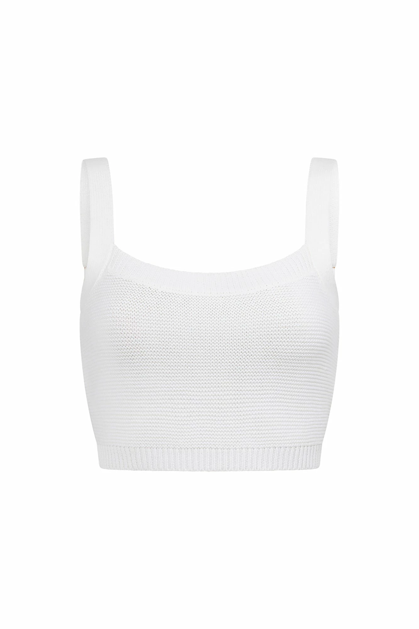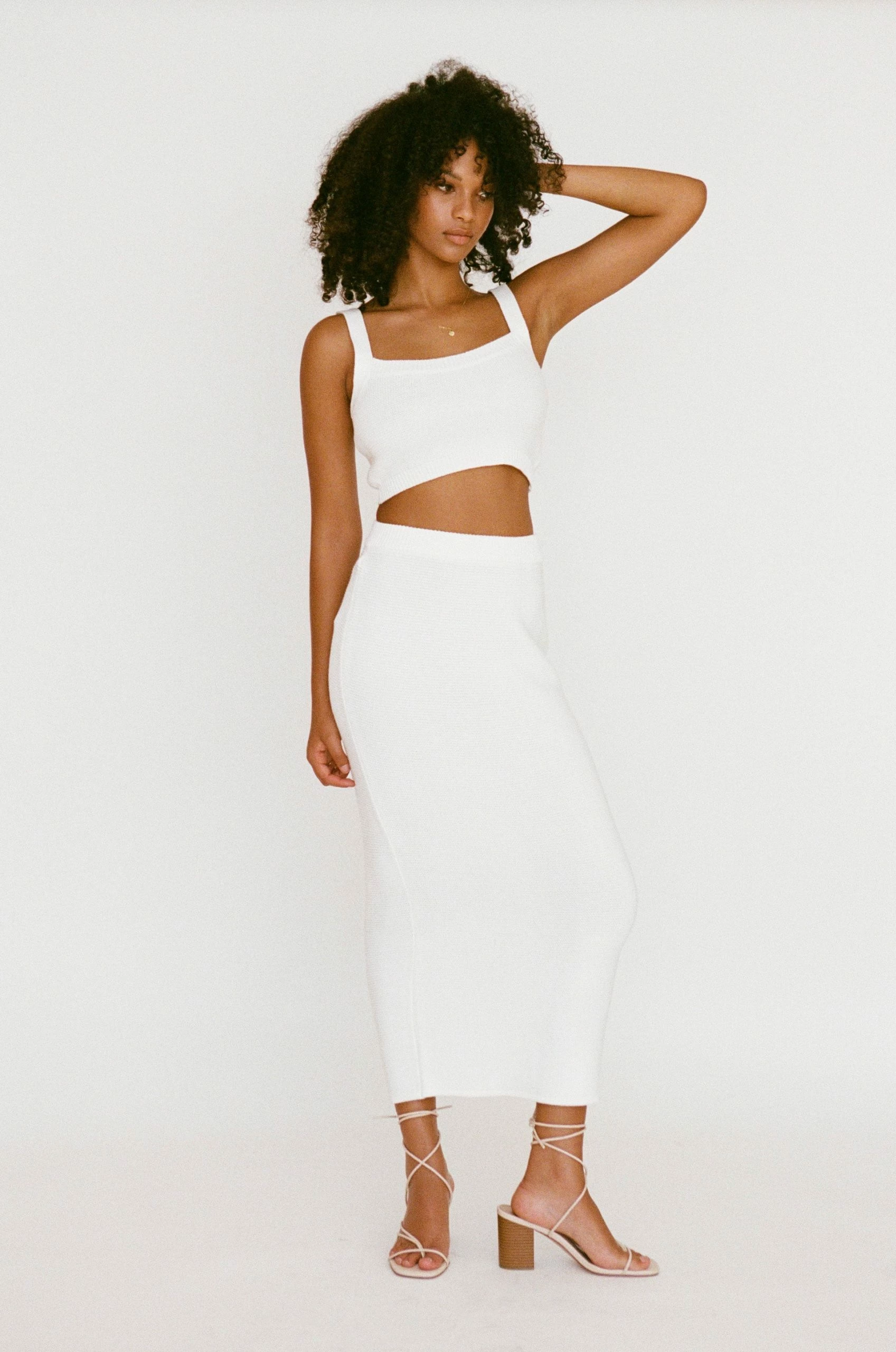 Wear it as a set or use it as a styling piece! The Nooa Top is made from a cotton blend knit in an off white hue. It is a cropped style featuring adjustable ribbed straps and a curved neckline. Get the set with the Nooa Skirt! Designed exclusively by Sabo.