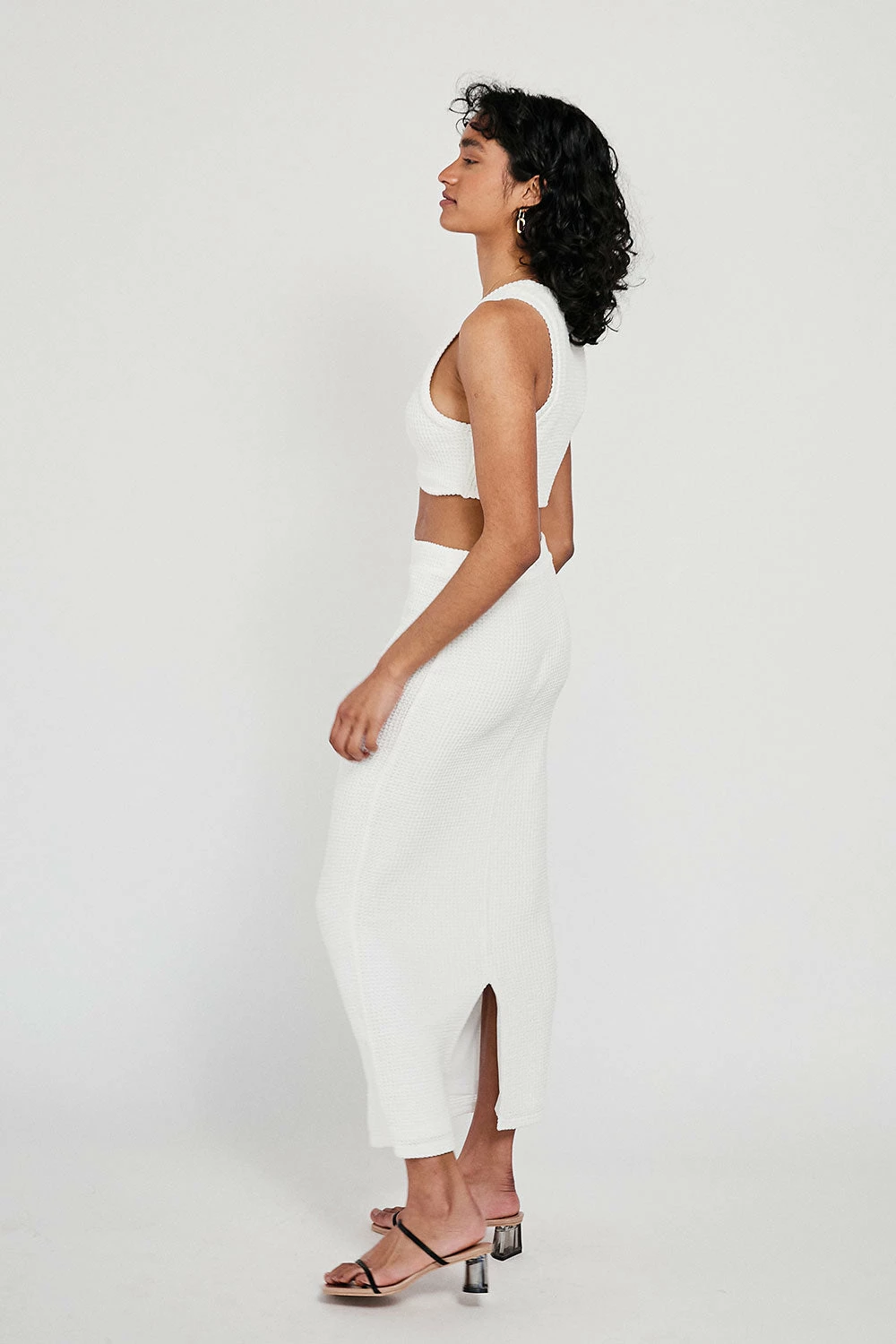 A super easy-to-wear look that can be dressed up with heels or paired back with slides! The Ollie Skirt is made from a textured off white fabric and features a high waisted fit and midi length. Complete the look with the Ollie Top! Designed exclusively by Sabo.