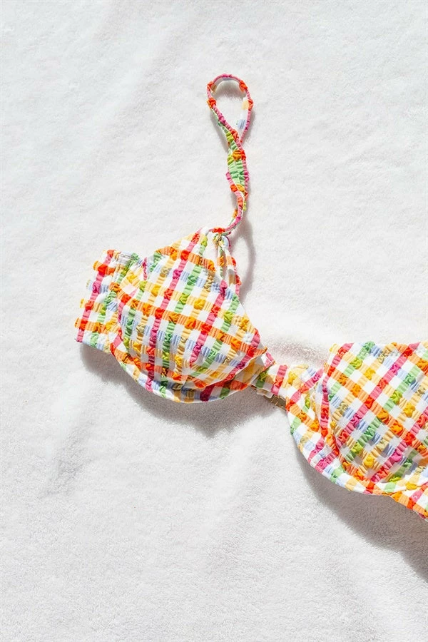 The pop of colour your summer wardrobe needs! The Torquay Balconette Top is made from a textured seersucker fabric in a multi gingham. It features underwire cups, adjustable straps and gold clasp closure at back. Get the look with the Torquay Brazilian Bottom! Designed exclusively by Sabo.