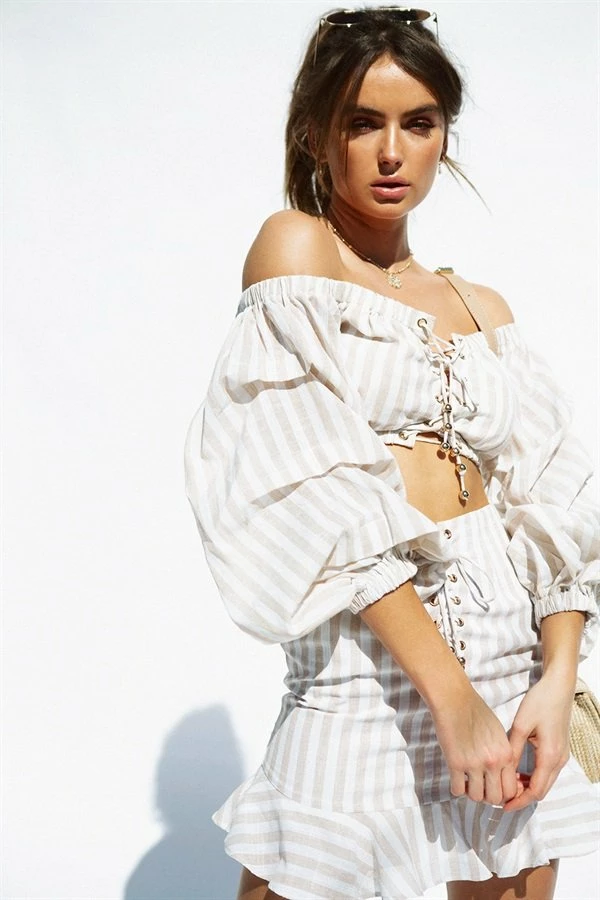 It’s all in the details! The Wynter Stripe Top is made from a lightweight white fabric with tan stripes throughout. It is a cropped, off shoulder style and features a split and lace up at centre front, gold eyelet and bead end detailing and puff sleeves. To achieve the look, push cuffs of arms up and allow sleeve to fall over elastic! By Sabo Skirt.