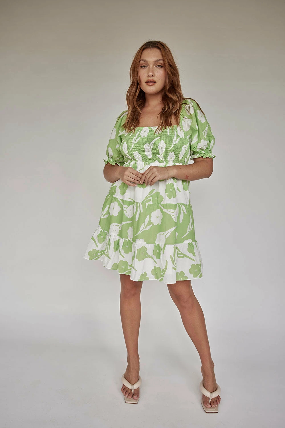 A staple go-to piece perfect for weekends with friends! The Xyla Dress is made from a natural lightweight cotton voile fabric with our exclusive mint floral print. It features short puff sleeves with ruffle trims, square neckline, shirred bust panel and a flouncy triple tiered skirt with contrast print detailing. Dress it up with the Strappy Lilly Heels for a long lunch! Designed exclusively by Sabo.