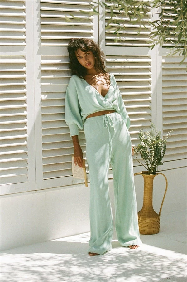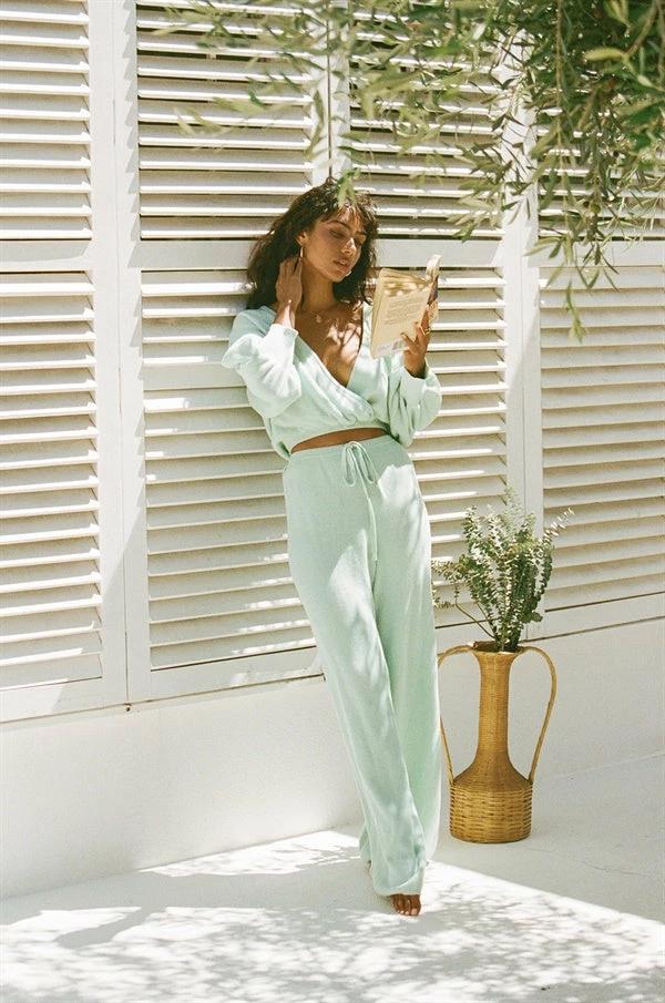 *THIS IS A FINAL SALE ITEM* Perfect for the cooler weather, the Zepplin Pants are made from a natural cotton knit fabric in a fresh mint hue. They are a high waisted style featuring a relaxed fit, elasticated waist and drawstring. Complete the look with the Zepplin Top! Exclusively designed by Sabo.